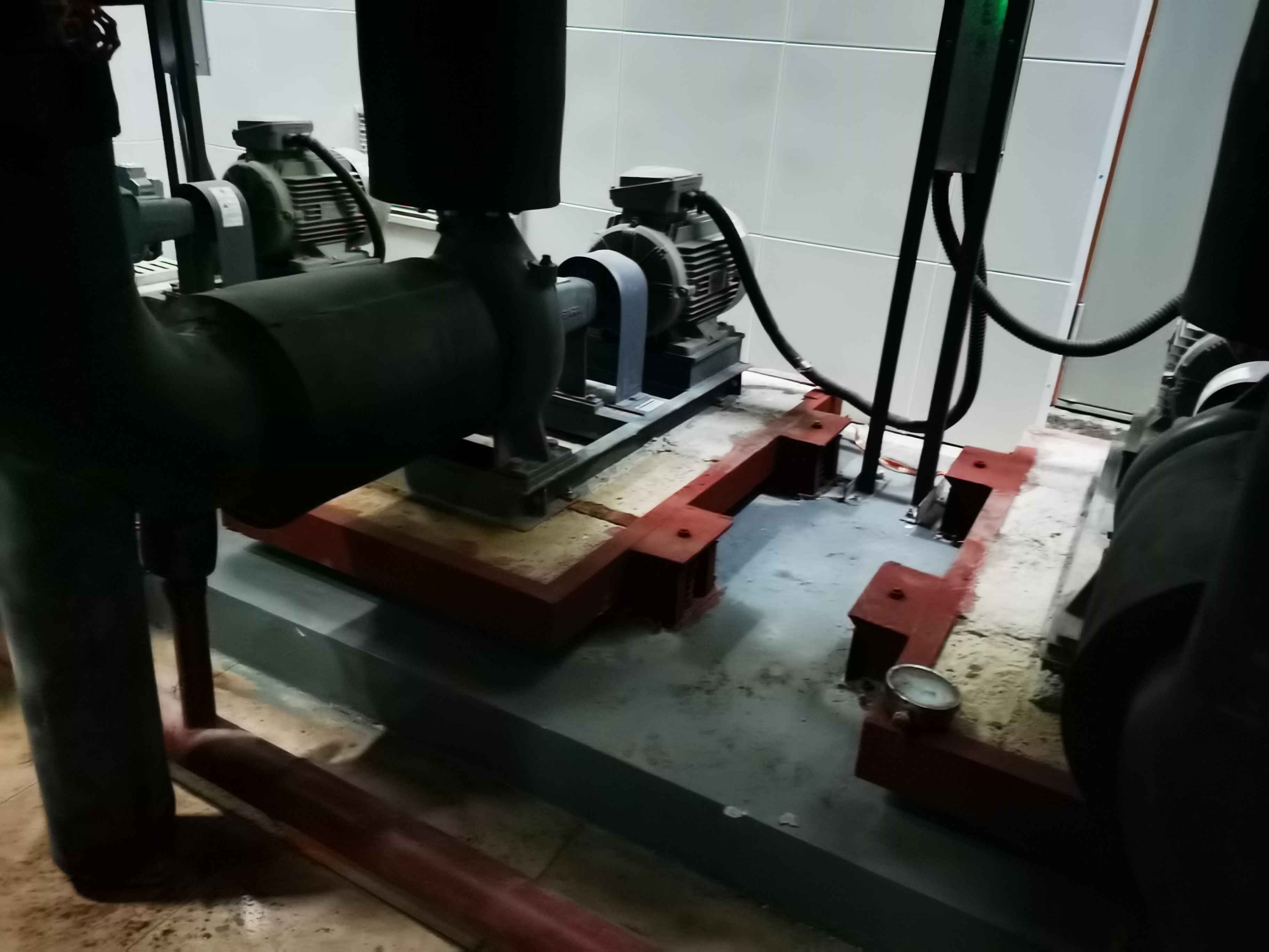 4、水泵主機系統(tǒng)落根于我們新建的減振框架上面,并通過DSF水泵專用復(fù)合非線性隔振器衰減振動后,再生根于地面。